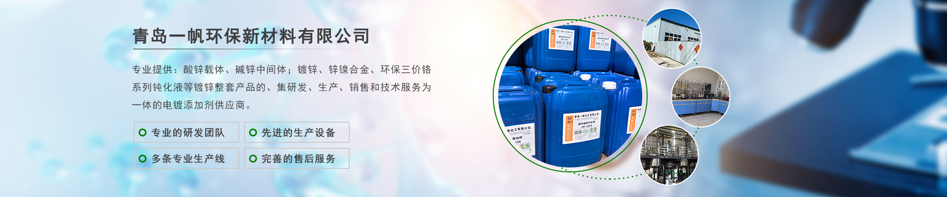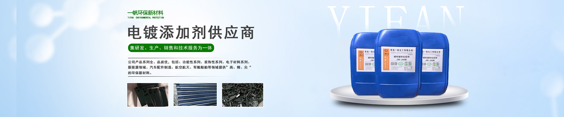 青岛一帆环保新材料有限公司主营酸锌载体、碱锌中间体等一站式电镀添加剂服务商!